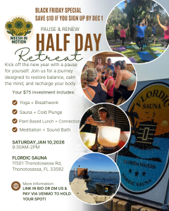 Join Meesh in Motion for another half day retreat on Lake Thonotosassa. We will start the day with an invigorating yoga practice, followed by sauna and cold plunge, vegetarian lunch and end the day with meditation and sound bath all on the shore of the lake.